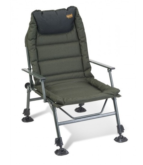 Praktické rybářské křeslo. Pohodlné loketní opěrky a silné polstrování v oblasti zad a hlavy zaručuje dostatečný komfort. Výhodou jsou i malé přepravní rozměry.