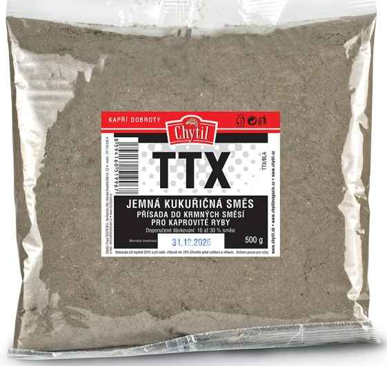TTX - mletá kukuřičná placka / 500 g Má lehce nasládlou vůni a díky jemnému mletí je vhodná jako základ do jakékoliv krmné směsi. Doporučený poměr je maximálně 1/3 TTX v krmení. TTX vytváří mléčný mrak a zvyšuje obsah směsi. Dále pomáhá slepit méně lepivé směsi. Je vhodná i samotná pro lov, kdy potřebujeme atraktivní mléčný mrak. Používá se i v method feederu jako "zátka" nad ostatní směsi.