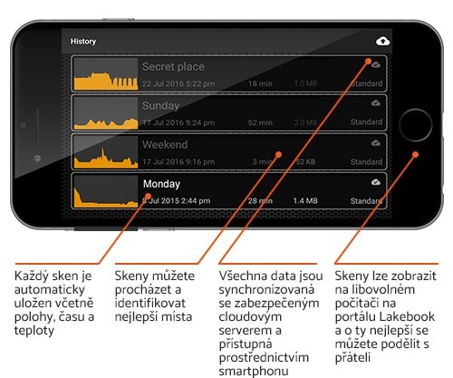 V aplikaci Deeper je jasně zobrazena každá ikona ryby, která je ještě doplněná o data o velikosti a hloubce.