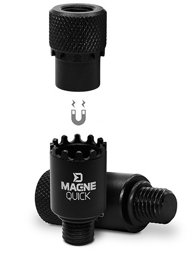 Inovativní rychlospojka, která byla důmyslně navržena a dlouhodobě testována vývojovým týmem značky Delphin. MagneQUICK funguje na principu extra silného magnetu uvnitř a systému výstupků a zářezů, které do sebe univerzálně pasují. Signalizátor si natočíte do vrchní části a spodní uchytíte do stojanu/vidličky. Následně obě části spojíte zakliknutím magnetu a sestava je připravena k použití. Po rybaření část se signalizátorem jednoduše rozpojíte jedním tahem a signalizátor uschováte pro transport. Odpadá tak dlouhé šroubování signalizátoru před každým rybařením. S rychlospojkou MagneQUICK jste připraveni okamžitě začít lovit.Tělo je kompletně kovové, vyhotovené CNC opracováním, což zajišťuje dlouhou životnost produktu. Magnet uvnitř spolu s výřezy na obvodu se starají o to, že jednotlivé části do sebe dokonale zapadají a kompaktně drží spolu bez vůle či možnosti protáčení a svévolného vypadnutí. Díky dostatečnému počtu zářezů si nastavíte signalizátor do požadované polohy a nehrozí žádné přetáčení, jak tomu bývá u modelů s kuličkovými ložisky.MagneQUICK je opatřen standardizovaným závitem, což umožňuje použití s drtivou většinou standardně vyráběných signalizátorů. Rovněž závit MagneQUICKu sedne do všech stojanů, či vidliček.Balení obsahuje 2 kusy.Technické parametryVnější průměr: 15mmVýška: 41mm