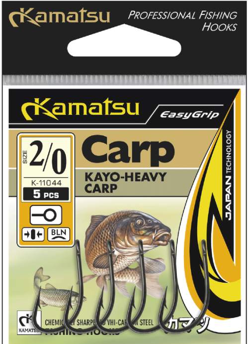 Exkluzivní série háčků Kayo Heavy Carp s očkem, jsou určeny na silový rybolov. Speciálně zahnutý tvar ramínka a očka zajistí vždy ideální sklon háčku při záseku, čímž dokonale eliminuje ztrátu ryb. Jedná se o velice pevné kované háčky. Háčky KAMATSU jsou dvoustupňově chemicky ostřeny pro maximální ostrost. Extra kvalitní karbonová ocel VHI-Carbon Steel zaručuje maximální odolnost proti tupení i při velmi častém používání. Vyráběny jsou výhradně Japonskou technologií tažení a každý kus je elektronicky testován! Háčky Kamatsu se netupí a neohýbají, dokonale drží maximální ostrost. Charakteristické jsou dlouhotrvající extrémní ostrostí hrotu. KAMATSU jsou jedny z nejpopulárnějších háčků na Evropském trhu. Balení obsahuje 5ks háčků