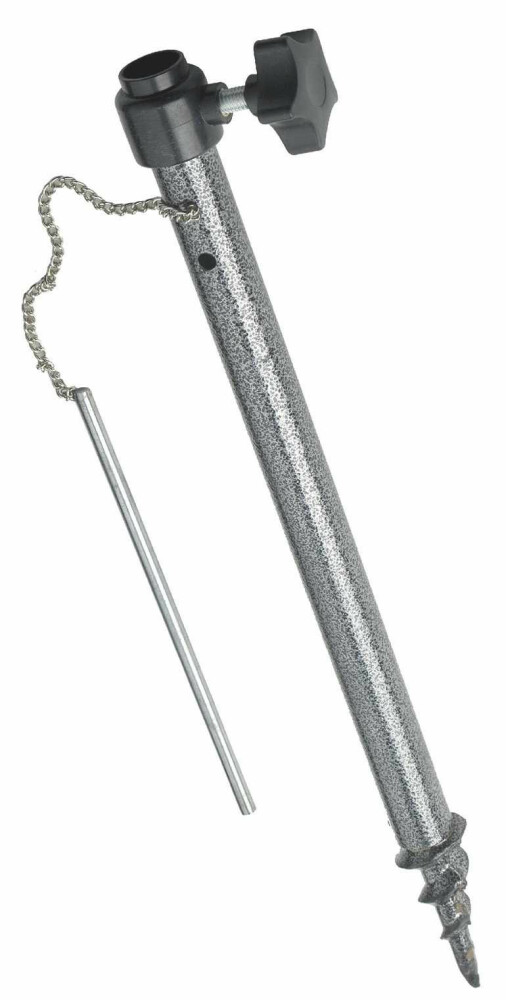 Robustní, celokovový držák deštníku, určený pro zavrtání do země a ukotvení deštníku ve tvrdém podkladu.