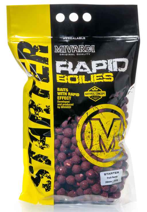 Vysoce atraktivní boilies, vyrobené z dobře stravitelných komponent, ptačích zobů, rybích extraktů a skutečných vajec. Vyznačuje se poctivým, naturálním vzhledem a bohatou strukturou. Neobsahuje žádná barviva ani umělá pojiva či jiné náhražky. Velmi dobře pracuje i ve studené vodě. Ihned po nahození se začíná pomalu rozpouštět a uvolňovat drobné částečky. Přináší větší počet záběrů při kratších vycházkách. Zároveň je velmi vhodné pro masivní pravidelné vnadění, když potřebujete na lovném místě udržet větší množství kaprů. Velkým trumfem boilies STARTER je jeho mimořádně výhodná cena. Toto boilies je dostupné ve skvěle vyladěné příchuti Monster & Halibut a ve sladké verzi Fruit Bomb tvořené osvědčeným mixem účinných ovocných esencí.
