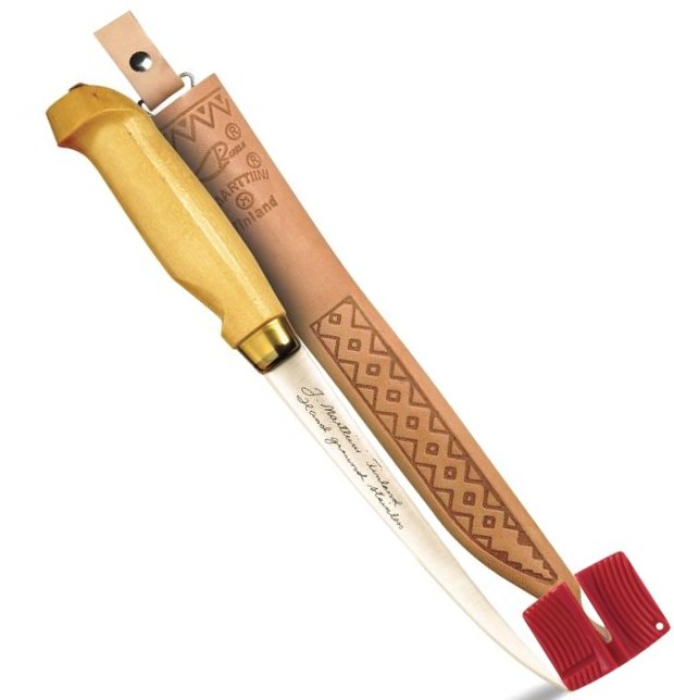 Klasický elegatní design tohoto filetovacího nože potěší oko i srdce každého uživatele. Čepel je z kvalitní švédské oceli, střenka z finské břízy. Kožené pouzdro je zdobeno rybářskými motivy, brousek slouží k jemnému dobroušení. celková délka nože (mm) 280 délka čepele (mm) 150